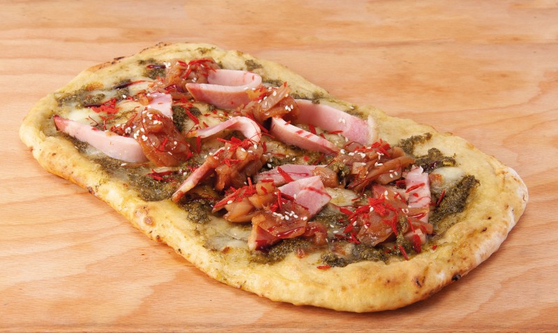 Pizza con pesto di finocchietto selvatico, porchetta e cipolla caramellata
